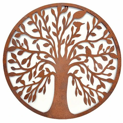 A wonderful Tree of Life wall art ornament for the garden or home. Made from metal with a brown rusty look finish this tree wall ornament is ideal to brighten up a dull wall or fence in the garden or indoors for a great effect to. 54cm diameter round wall art with a hook to easily mount on the wall. Lovely quality piece of garden wall art.