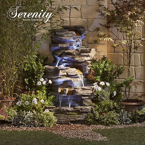 This cascading rock pool water feature is gently illuminated for a dramatic effect. Perfect for creating an evening retreat in the garden or conservatory, where the sound of cascading water will soothe the senses and help you unwind.