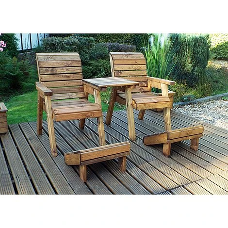 Deluxe Lounger Set Straight: The Deluxe Lounger Set is an ideal bistro set for people who seek a relaxing garden experience and are attracted to the natural beauty of wood. The comfortable loungers share a small table which is very handy as you can rest several things there like your glasses, your drink, a snack, or a book. The footstools will allow you to fully extend your body for the ultimate lounging experience. Solitude is good, company is ideal and three’s a crowd! The Deluxe Lounger Set comes with optional cushions in three gorgeous colours. The set is made of Scandinavian Redwood which is a beautiful and durable wood resistant to decay and disease. It is fully treated for your peace of mind. Invite your loved one to sit with you and stargaze together or talk about life amid your lovely garden. No matter the moment, the Deluxe Lounger Set is sure to enhance your outdoor space with its comfortable design and its rustic charm of natural wood.