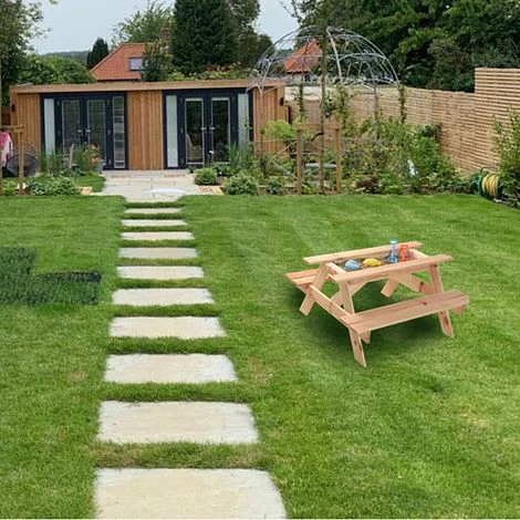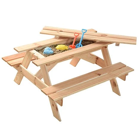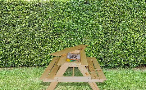 Suitable for ages 3 and up, these kids table and chair sets are made from 100% FSC Certified Pine Wood that supports even large kids up to 50kg per seat. The wood is untreated, so why not stain it any colour of your choosing? Red? White? Pink? Green? Yellow? The only limit is what you can image for this picnic set . You can make it a blue water table, but when you’re done it converts to a wooden garden table and chairs suitable for a BBQ or dinner outside – never to early to start eating Al Fresco! This outdoor table and chairs offers space for four kids and is a premium quality you can trust. So whether you fill it with toys, water, or play sand for kids it’s a great companion for any kids playhouse.