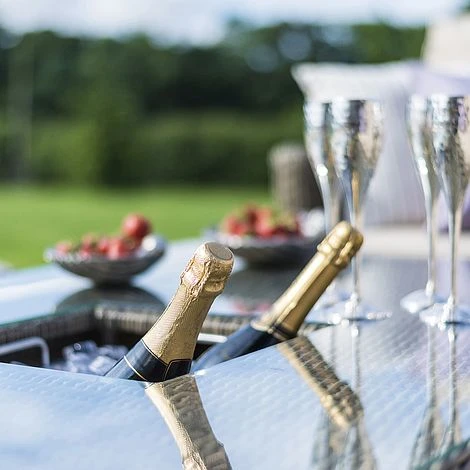 The Winchester Sofa Dining Set is a high quality and stylish furniture set perfect for dining in comfort in the summer months. The Winchester Sofa Set is made with half rounded rattan weave, handwoven onto a sturdy powder coated aluminium frame for a rust free design to ensure use all year round. The Maze Rattan Dining Set consists of a three seat sofa and two armchairs all with seat and back cushions for added support and comfort. The Winchester Set also includes two cushioned footstools which can also be used as additional seating, a rectangular adjustable dining table with a fabulous integrated ice bucket great for socialising with friends and family. The practical 8mm tempered safety glass table top with its rising feature allows you to go from lounging to dining.