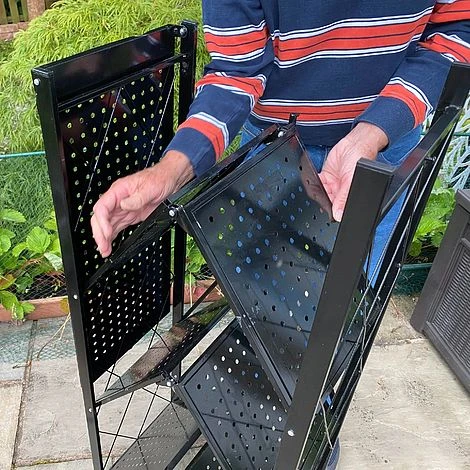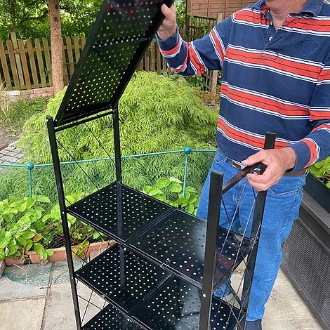 An ingenious collapsible greenhouse and plant protection grow house, the Multiflex is a unique, quick-build solution for growing crops and plants on balconies, patios and other small spaces. The frame itself comes as a single piece that folds flat when not in use. To assemble, all you have to do is pull gently at both sides and the frame self-assembles in mere seconds! Add the fitted cover over the top and you are ready to grow! When not in use, the Multiflex folds flat just as easily, making it absolutely ideal for those who want to save space or minimise clutter. The solid stainless steel structure is robust and weatherproof for repeated outdoor use. There are two sizes available – 4 tier shelf and 5 tier shelf – with shelves that are removable for growing taller plants. A set of 4 wheels at the base allow for easy transportation, though these can also be removed for added stability in windy weather. There are two cover options, both with a large zipped door for easy access. The 4mm mesh netting cover protects fruit & veg from birds and insects, while the reinforced poly cover ripens crops such as tomatoes in summer. Alternatively, buy both covers for protection throughout the growing season!