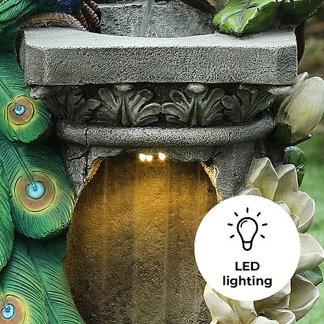 This garden water fountain features a stunning peacock statue, with magnificent colours, and a lovely background of flowers. The peacock sits atop a pillar, which is gently lit from inside by the warm glow of an LED light. Water emerges from a flower on top of the pillar.This is a self contained system, meaning setup is extremely easy and the fountain does not need to be connected to a water source, just topped up with water. All equipment needed for your own spectacular display – just add water and power.