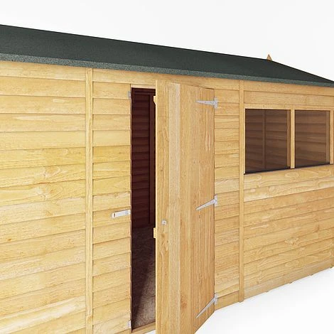 The Waltons 10 x 6 Reverse Apex Overlap Wooden Shed is a spacious garden building designed to offer secure and durable outdoor storage. The large interior is ideal for storing bikes, wheel barrows and lawn mowers, as well as gardening tools and equipment. Featuring a shatterproof styrene glazed window to the front, this building fills with light, making it easy to locate your items. The single door has been braced with internal ledging, and a pad bolt is included for security.